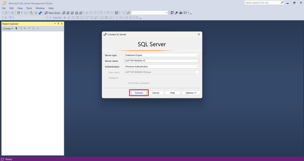If everything works, you’ll be taken to the main SSMS interface. If you run into any issues, make sure your SQL Server instance is selected under “Server name.” This will usually be your computer’s name. Still having trouble? Try selecting “Trust server certificate” under the “Options” button. This can often resolve connection issues.